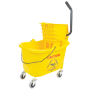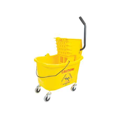 Features 3" Non-Marking Steel Casters, rounded shape for easy pouring, rubber wringer handle for easy pouring and multi-lingual caution markings on the side of bucket. Available in your choice of yellow, red, or green