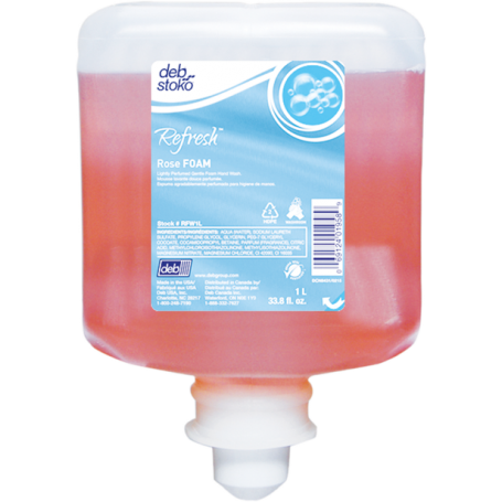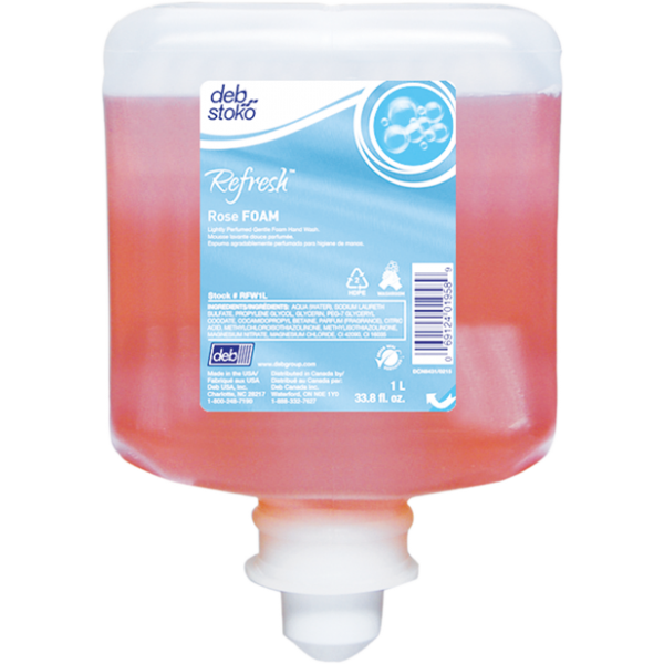 A Green Seal Certified, Rose scented foaming hand soap, containing skin conditioner that is biodegradable, with mild surfacants that meet DECO guidelines