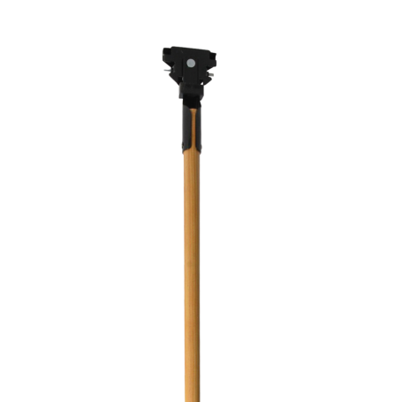 A 60" wooden dust mop handle featuring a metal swivel clip that snaps around the dust mop frame for quick and convenient change out of the dust mop head.