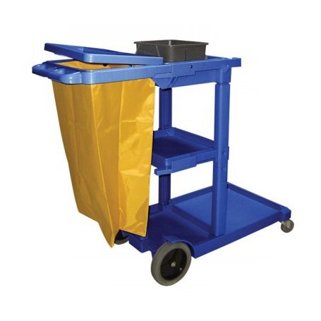 Featuring 3 sturdy shelves, a mop and broom holder and a large 25 gallon zipper bag, this handy cart keeps all your cleaning tools close at hand and secured. Includes a spacious front platform which is large enough to hold an additional trash can or even a mop bucket & wringer. Perfect for any janitorial staff, from schools to restaurants, offices, and more.