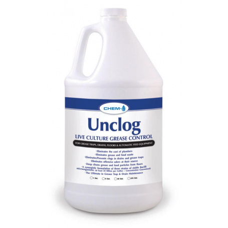 Unclog is a powerful, natural live culture grease control solution for grease traps, drains, floors & automatic feed equipment. It eliminates the cost of plumbers, eliminates grease and food waste, eliminates/prevents clogs in drains and grease traps, eliminates offensive odors at their source and deep cleans grease and food particles from floors. Unclog is a synergistic formulation of three strains of stable Bacilli microorganisms (at least 50 billion per gallon). It is the ultimate in grease trap & drain maintenance.