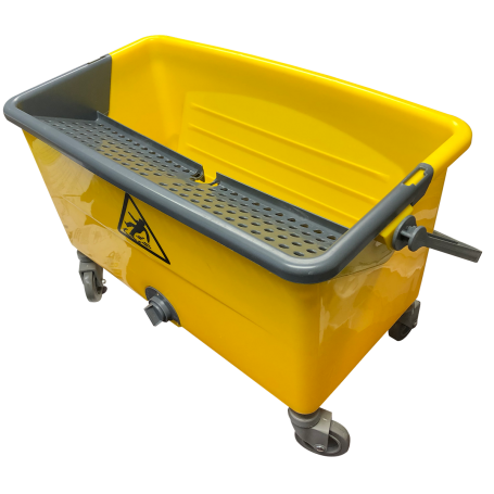 Easily maneuverable, 22 quart capacity, with 2 inch heavy duty metal casters. Includes an interior drip grid for drying & an emptying spout.