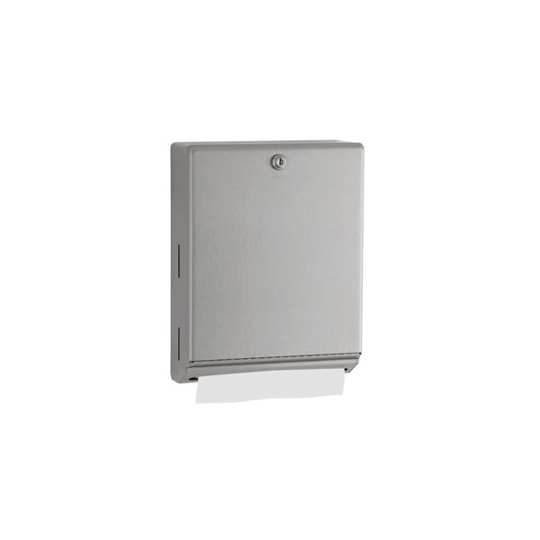 Satin-finish stainless steel. Dispenses 400 C-fold or 525 multifold towels. Door has tumbler lock and piano-hinge. Hemmed towel tray opening.